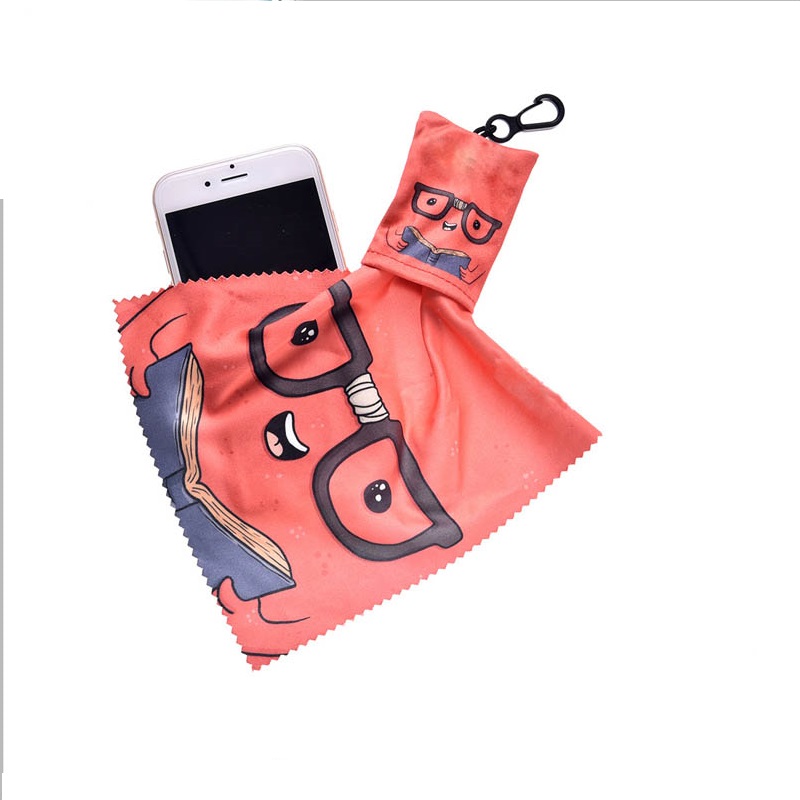 Material : poly-cotton 200gsm,pouch size 5*7cm, cleaning cloth 15*18cm one side allover printing, plastic dog clip .